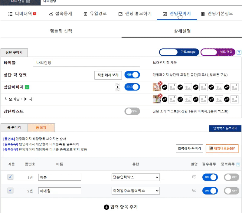 랜딩 꾸미기->폼 꾸미기->내 맘대로 폼 DIY에서 랜딩 페이지에 폼의 디자인을 변경할 수 있습니다. 폼 DIY에서 `ON`으로 설정후에 색상/폰트/글자 크기/폼간 간격 등 다양하게 변경하여 나만의 폼 디자인을 사용하실 수 있습니다.