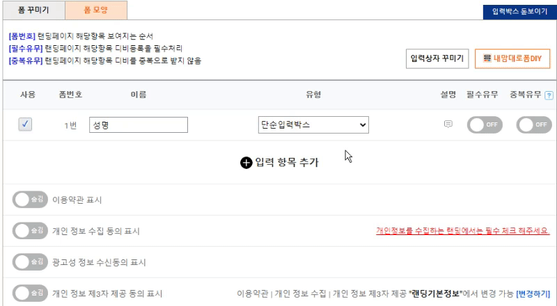 수집 받으려는 항목을 추가하려면 `입력 항목 추가`를 통해서 추가 가능합니다. 항목을 제거하려면 사용 부분에 체크를 해제하면 제거됩니다.
