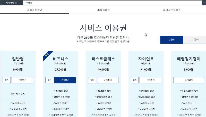 모든 서비스 이용권은 서비스 이용 기간을 제외한 모든 서비스가 동일하며 기간에 따라 SMS 이용권이 추가로 지급이 됩니다.