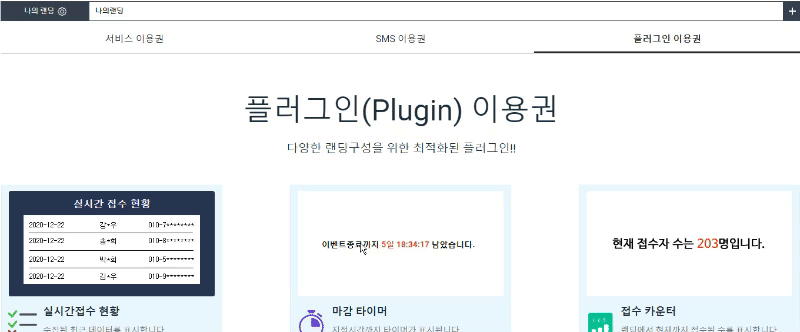 각 플러그인은 구매 후에 랜딩 꾸미기->플러그 인에서 설정을 할 수 있으며 원하는 위치에 추가가 가능합니다.
