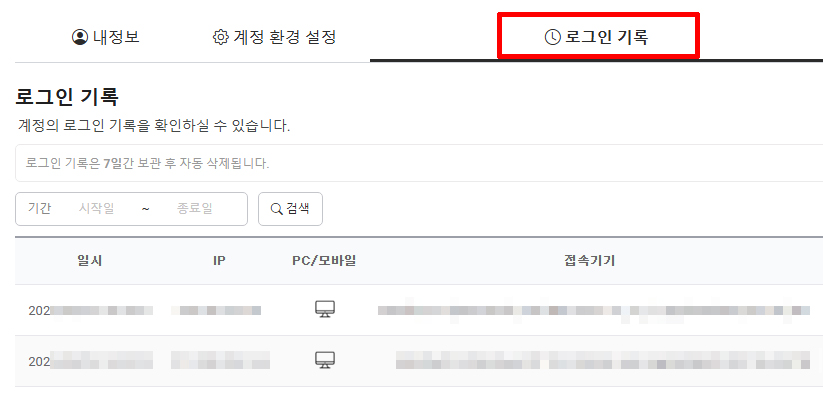 1. 로그인 기록 조회디비카트에 로그인한 기록을 확인 가능하도록 기능이 추가되었습니다. 로그인 시 자동으로 로그인 기록은 남기게 되며 기록은 최대 7일간 보관되고 7일이 지나면 자동 삭제됩니다.접속 일시, 접속 IP, 접속 기기를 확인하실 수 있습니다.
