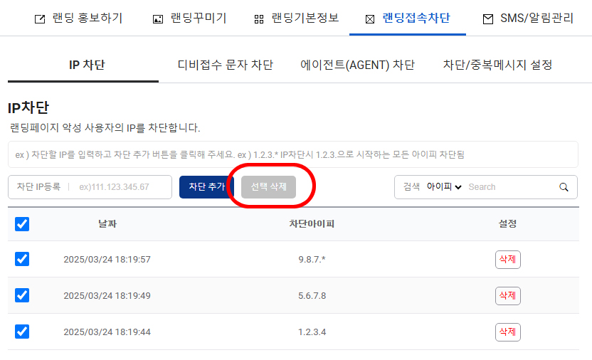 변경 위치 : 랜딩 접속 차단->IP 차단->선택 삭제위와 같이 디비카트의 기능이 추가/개선되었습니다.디비카트는 항상 좋은 서비스가 될 수 있도록 노력하겠습니다.감사합니다.