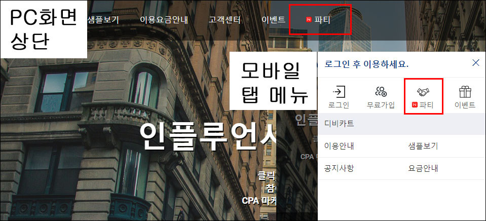 ② 우측 상단 '로그인' 아이디가 없는경우 '무료회원가입' (※ 디비카트 & 파티 아이디를 공용으로 사용가능)