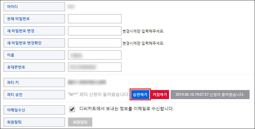 ⑥ 디비카트 > 내정보 '파티 승인' 파티 연결완료