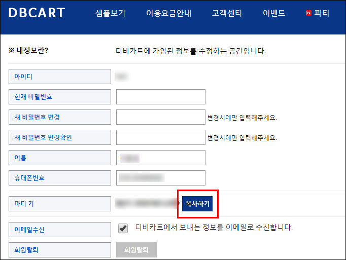 □ 디비카트 & 파티사이를 연결하기 위한 인증키 입니다. (디비카트 > 내정보에서 파티키를 확인 가능합니다)