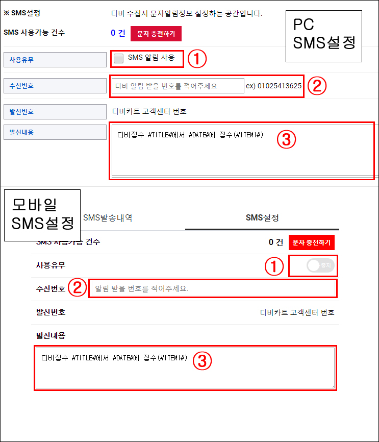 □ ※필수설정 공용 : [디비내역 > SMS관리 > SMS설정 > ①수신번호 & ②발신내용] 설정