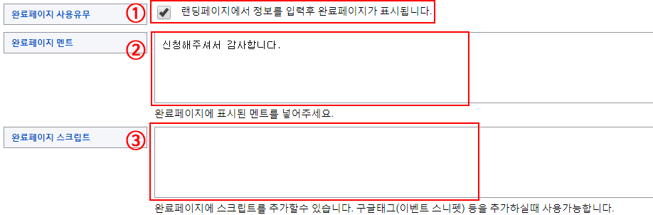 ③ 완료페이지 스크립트는 페이스북이나 구글 또는 기타 완료페이지에 사용해야할 스크립트를 넣으실경우 추가하시면됩니다.