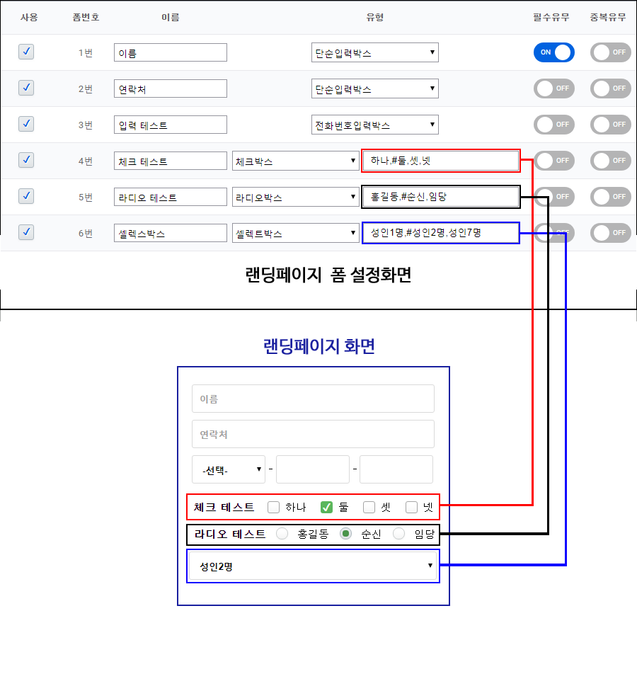 위 이미지 처럼 콤마(,) & 샵(#)에 따라서 랜딩페이지 설정항목 개수 및 기본선택으로 보여집니다.