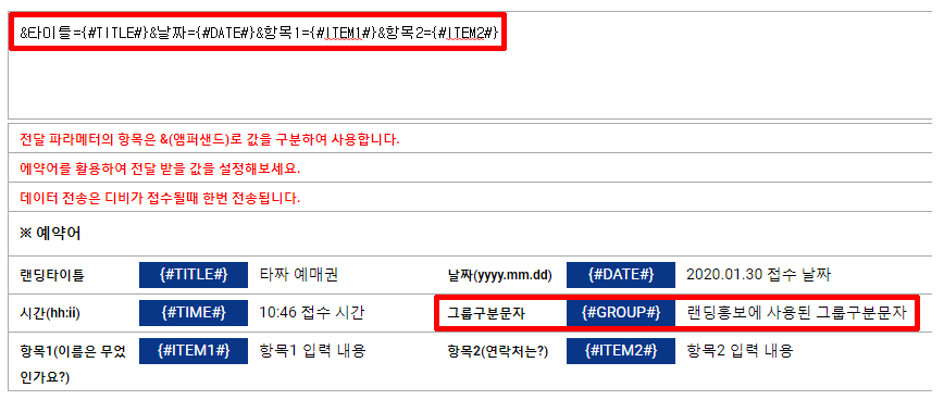 *그룹구분문자 예약어 : 데이터(DB)를 외부에 설정된 주소로 그룹구분문자도 보낼 수 있도록 추가