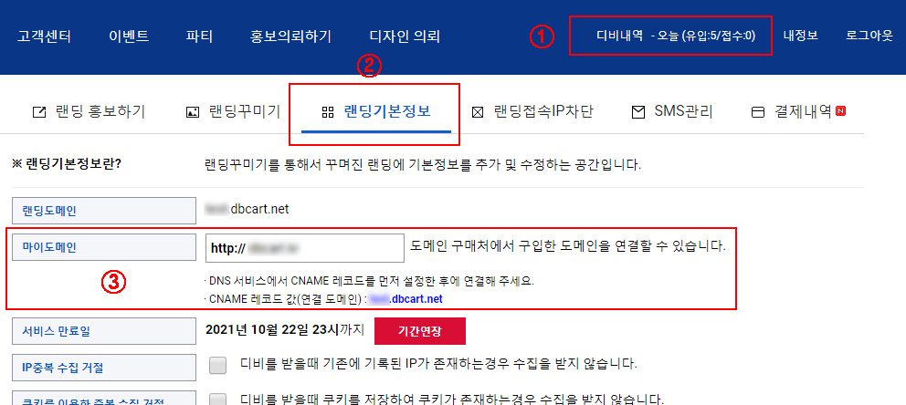 ① -> ② -> ③ 클릭하시면 마이도메인 세팅 페이지로 이동 후 개인 도메인을 입력하시면 됩니다.