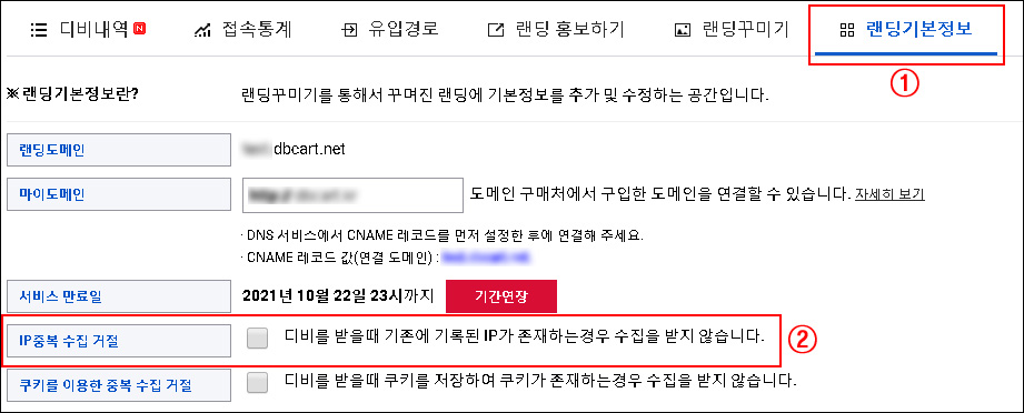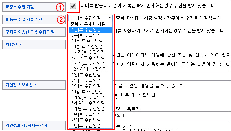 ② IP중복 수집 거절 기간 : 사용유무를 체크시 기간을 설정할 수 있으며, 1분 ~ 3년까지 다양하게 설정 후 하단에 '저장하기' 클릭