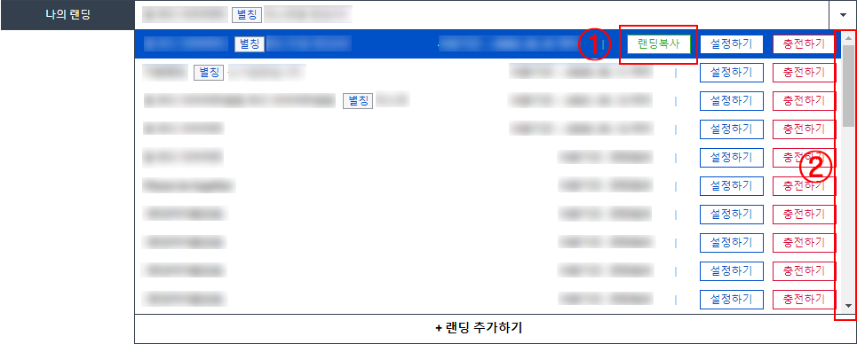 ① 나의 랜딩에서 선택된 랜딩페이지에는 랜딩복사 버튼이 생성되어 해당 랜딩페이지를 복사할 수 있도록 하였습니다.