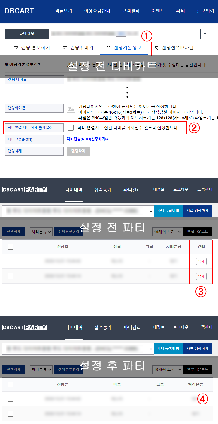 ④ 파티연결 디비 삭제 불가설정을 체크하는 경우 파티 > 디비내역 > 관리부분이 보여지지 않습니다. 즉 파티에서 해당 디비를 삭제 할 수 없습니다.