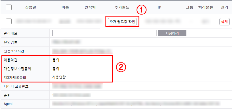② 이용약관/개인정보수집동의/제3자제공동의를 확인이 가능하며, 제3자제공동의는 랜딩페이지에 사용하지 않음을 확인이 가능합니다.