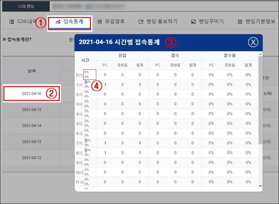 ③ 선택한 해당 일자에 시간별 접속통계 레이어가 나타납니다 (PC&모바일 동일)