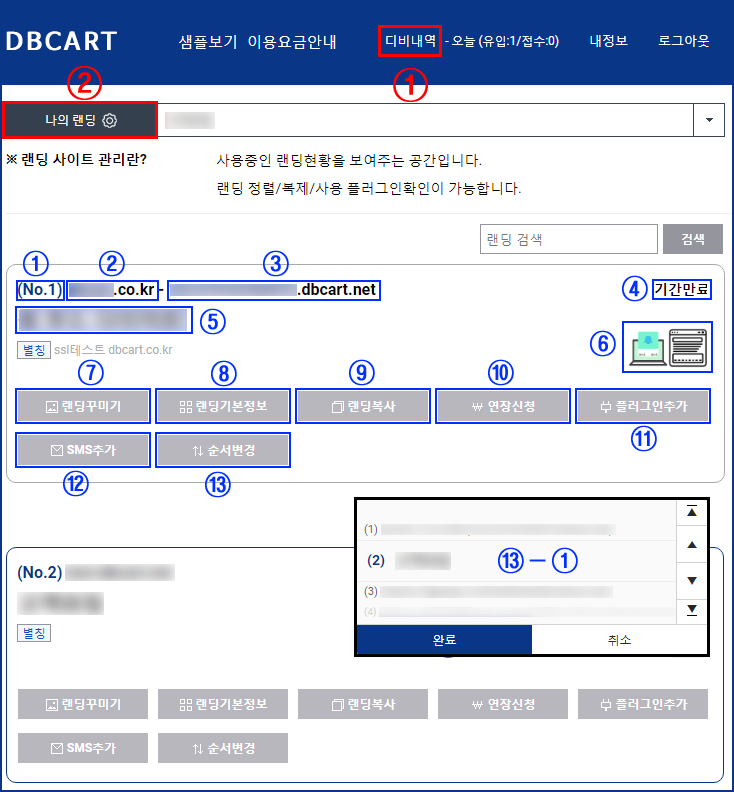 안녕하세요. 디비카트입니다.이번업데이트는 여러랜딩 생성시 관리가 불편한 부분이 있어 랜딩 관리를 기능을 추가하였습니다.추가적으로 네이버 광고에 사용되는 로그분석용 픽셀 추가 기능이 업데이트 되었습니다.[목차]1. [나의랜딩] 랜딩 사이트 관리 추가2. [픽셀관리] 네이버 광고 로그분석 추가■ [나의랜딩] 랜딩 사이트 관리 추가※ 업데이트 내용 : 하나의 계정에 사용중인 모든 랜딩을 한눈에 확인 및 '나의랜딩'에서 보여지는 순서변경이 가능하도록 기능을 추가하였습니다.※ 업데이트 위치 : ① 디비내역 > ② 나의 랜딩 선택※ 설명① '나의 랜딩'에서 보여지는 순서 번호② 마이도메인 표시③ 디비카트 랜딩주소 표시④ 랜딩 남은 기간 표시⑤ 랜딩 제목 표시⑥ 랜딩 사용중인 플러그인 표시⑦ 랜딩꾸미기, ⑧ 랜딩기본정보, ⑨ 랜딩복사, ⑩ 연장신청, ⑪ 플러그인 추가, ⑫ SMS추가⑬ 순서변경⑬-① 순서변경을 선택한 랜딩페이지 위치를 이동하기 위한 기능이며, '위,아래,처음,마지막'으로 랜딩순서를 변경하실 수 있습니다.