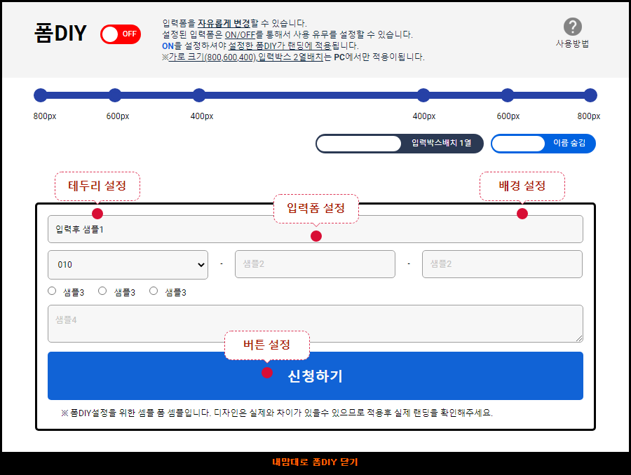 ㄴ. 각 항목 설정(샘플 보기를 통해서 확인)ㄷ. 저장하기3. 항목 설명ㄱ. 가로 크기 설정폼의 가로 크기를 설정할 수 있습니다. 800,600,400으로 사이즈를 설정할 수 있습니다.※ 가로 크기는 모바일의 화면 크기로 인하여 PC에서만 적용이 됩니다.