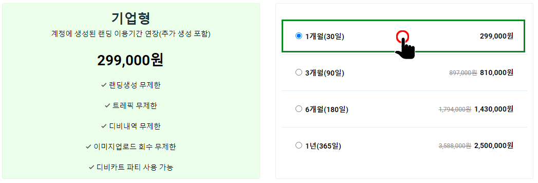 - 신청하신 서비스 기간이 해당 랜딩에 추가됩니다. 기업형 1개월 신청 시 기존 기간이 20일이 남아 있다면 1개월+20일이 늘어나게 됩니다.