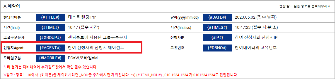 신청자 Agent 예약어가 추가되었습니다. 신청자의 Agent 전송이 필요한 경우 {#AGENT#}예약어를 통해서 전달하실 수 있습니다.
