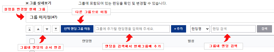 그룹별 설정 : 여러 랜딩을 그룹에 추가하고 그룹에 속해있는 랜딩의 순서를 변경할 수 있습니다.