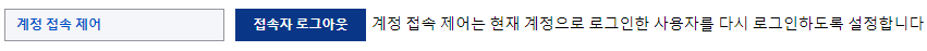 내정보->계정 접속 제어 에서 실행이 가능합니다. 1. `접속자 로그아웃`을 실행하면 현재 계정으로 접속된 모든 사용자가 로그아웃되고 다시 로그인을 해야 합니다.