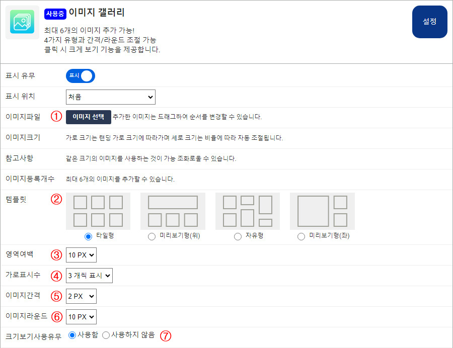 ① 이미지 파일을 추가할 수 있습니다. ② 갤러리의 유형을 선택할 수 있습니다. - 타일형 : 정사각형의 이미지로 표시가 되며 3번의 표시 수에 따라 같은 크기의 이미지로 표시됩니다. - 미리보기형(위) : 첫 번째 이미지를 큰 이미지를 표시하고 이미지는 타일형으로 표시며 클릭시 첫번째 이미지에 표시됩니다. - 자유형 : 이미지의 크기에 따라 자율형으로 배치가 됩니다. - 미리보기(좌) : 첫번째 이미지를 왼쪽에 크게 보이고 이미지는 타일형으로 표시되며 클릭시 첫번째 이미지에 표시도비니다. ③ 플러그인이 표시되는 영역의 여백을 설정합니다. ④ 가로로 표시되는 최대 개수를 설정합니다. ⑤ 이미지와 이미지 사이의 간격을 설정합니다. ⑥ 각 이미지 테두리에 둥근 모서리를 설정합니다. ⑦ 이미지를 클릭하는 경우 원본 이미지를 별도로 표시합니다.