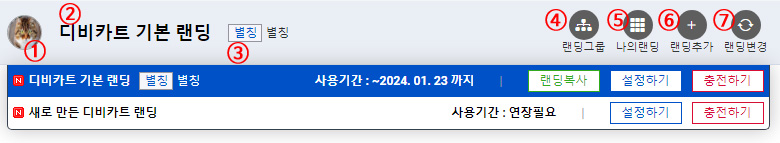 ① 미리보기 이미지(og:image)로 설정한 이미지가 표시되며 기본이미지는 디비카트 로고가 표시됩니다. ② 현재 랜딩의 타이틀이 표시됩니다. 클릭시 랜딩 변경목록이 표시됩니다. ③ 별칭으로 설정한 텍스트가 표시됩니다. ④ 랜딩그룹을 관리할 수 있는 링크입니다. ⑤ 나의 랜딩 목록을 확인 할 수 있는 링크 입니다. ⑥ 새로운 랜딩을 추가 할 수 있는 버튼입니다. ⑦ 랜딩을 변경할 수 있습니다.
