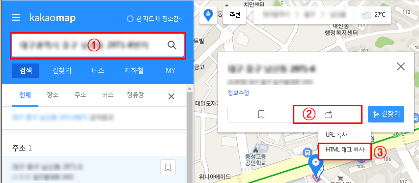② 아이콘 클릭 -> ③ HTML 태그 복사 클릭