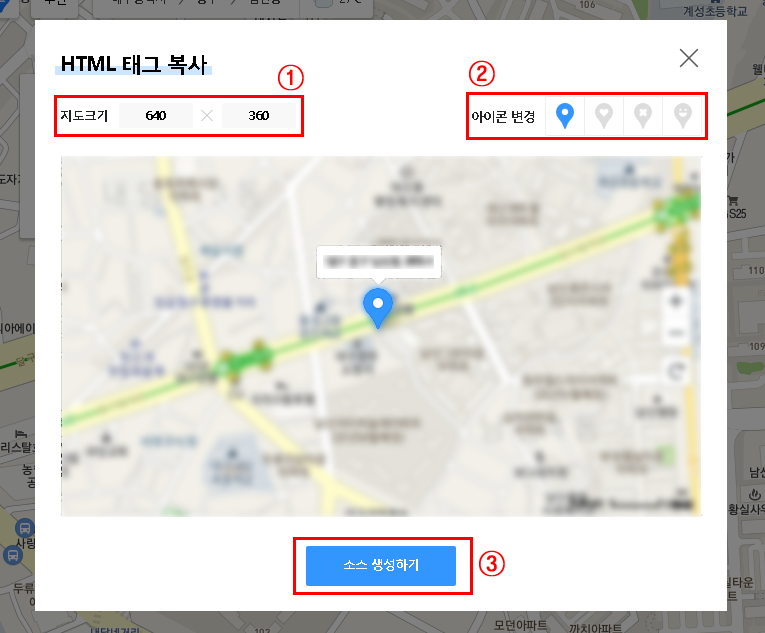 ③ 지도크기/아이콘변경/지도위치 확인 후 소스 생성하기