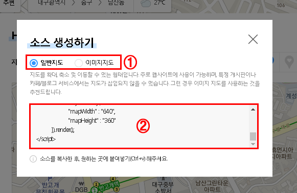 ① 일반지도 : 홈페이지에 보여질 지도 확대,축소 및 이동할 수 있는 형태