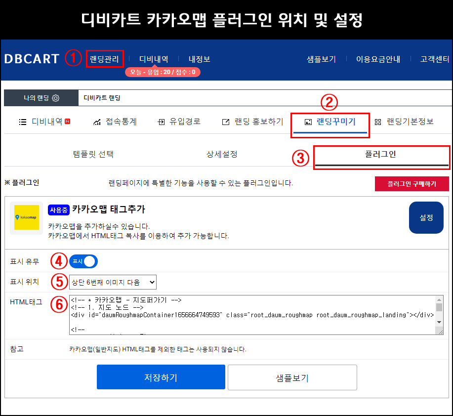 ① 랜딩관리 > ② 랜딩꾸미기 > ③ 플러그인 > 카카오맵 태그 플러그인 설정
