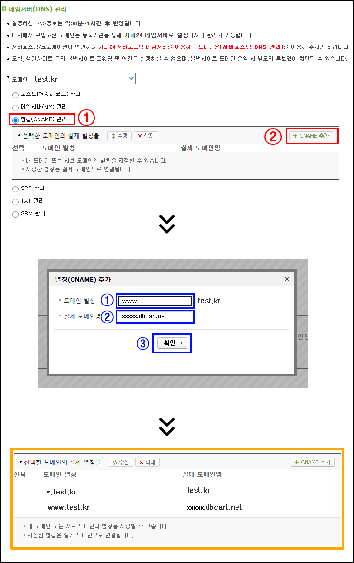 'www.test.kr' 이렇게 주소창에 입력하면 'xxxxx.dbcart.net'으로 이동합니다. (단, CNAME 루트도메인 설정을 할 수 없는관계로 test.kr을 입력시 사이트가 뜨지 않습니다.)