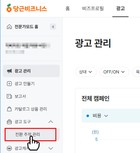 5. 광고페이지에서 좌측 메뉴중에 광고도구->전환 추척 관리를 선택합니다.