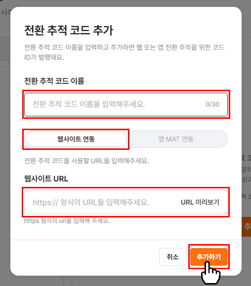 7. 전환 추적 코드 이름과 광고가될 웹사이트 URL을 입력하고 `추가하기`를 해주세요.