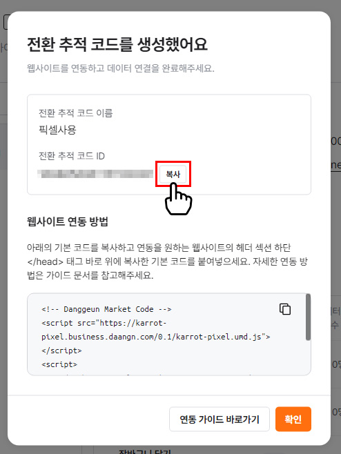 8. 생성된 전환 추적 코드 ID를 `복사`하고 `확인`을 클릭합니다.