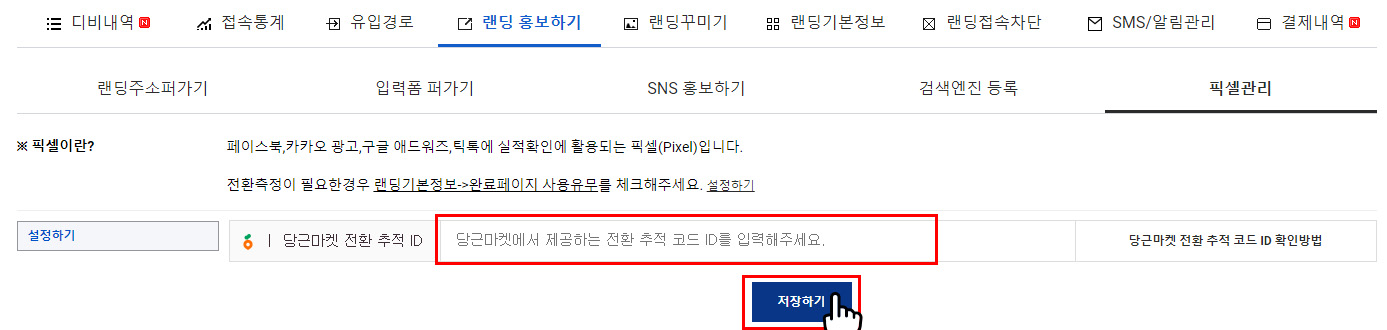 10. 디비카트 `랜딩홍보하기->픽셀관리` 페이지에서 `당근마켓 전환 추적 ID`를 입력합니다.