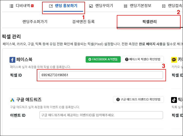 15. (디비카트) > 랜딩 홍보하기 > 픽셀관리 > 페이스북에 복사한 숫자를 등록 후 [저장하기] 선택합니다.