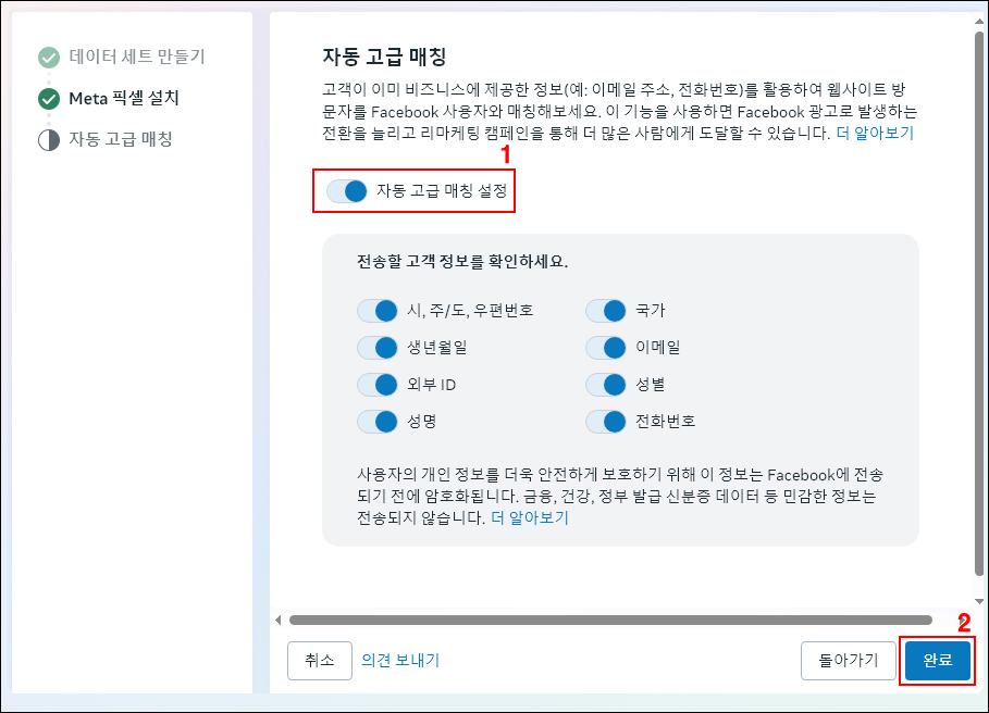 17. [자동 고급 매칭 설정] 필요한 항목을 선택 후 [완료] 선택합니다.