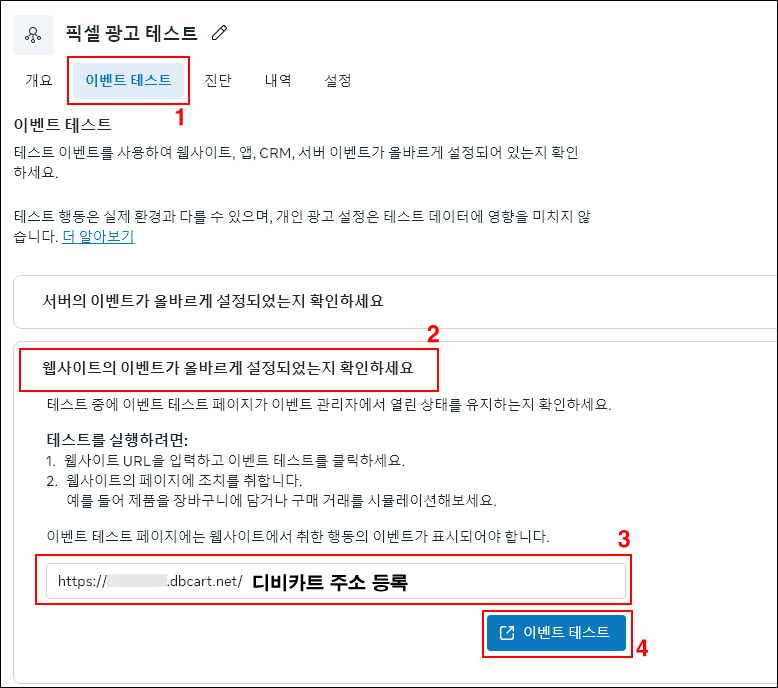 18. [이벤트 테스트] 선택 > [웹사이트의 이벤트...] 선택 > 디비카트 주소를 등록 > [이벤트 테스트] 선택합니다.