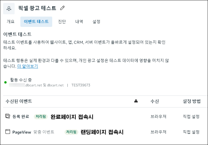 19. [이벤트 테스트] > 수신된 이벤트에 값이 표시가 되면 픽셀 설정이 마무리 됩니다.