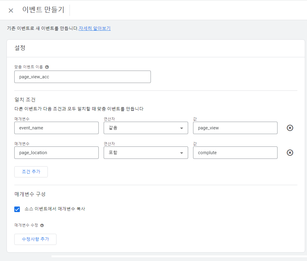 6. 매개변수 구성에 `소스 이벤트에서 매개변수 복사`를 체크가 된 상태로 선택합니다.
