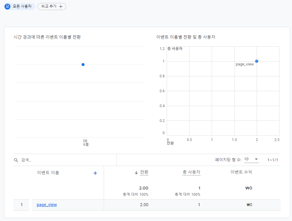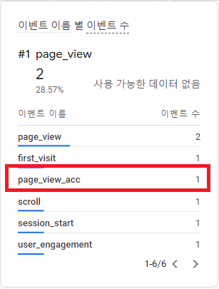 9. 구글 애널리틱스에서 보고서->실시간으로 이동 후에 `이벤트 이름 별 이벤트 수`에 예에서 입력한 page_view_acc가 표시되는지 확인합니다.