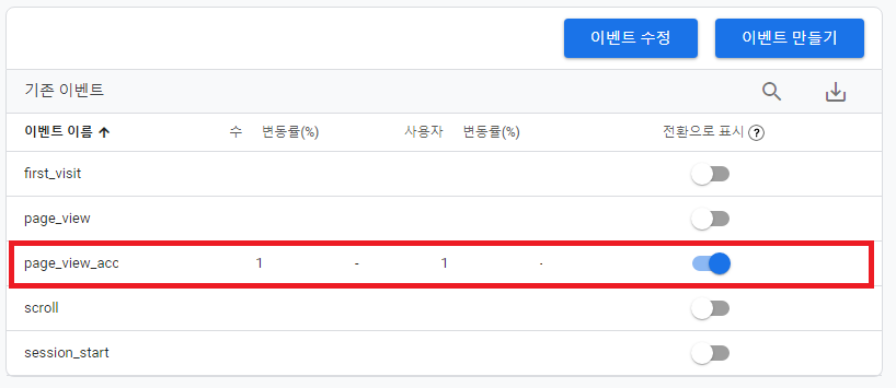 10. 구성->이벤트에서 예에서 입력한 `page_view_acc`가 표시가 되면 `전환으로 표시`를 선택합니다.