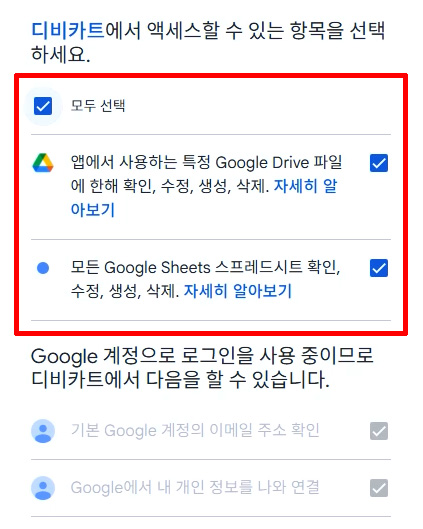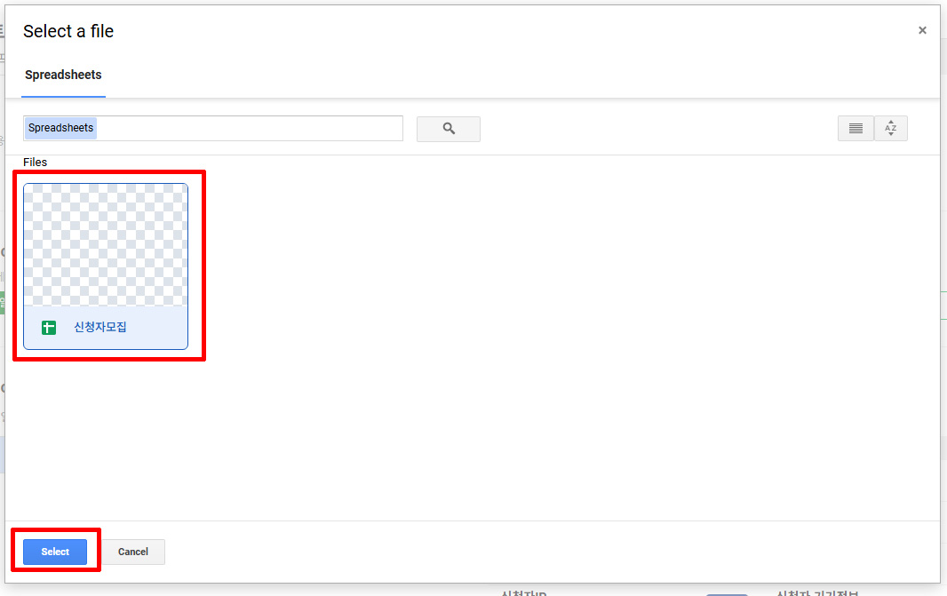 4. 계정 연결이 완료되면 스프레드시트(Google Sheets)에서 스프레드시트 파일을 선택합니다.