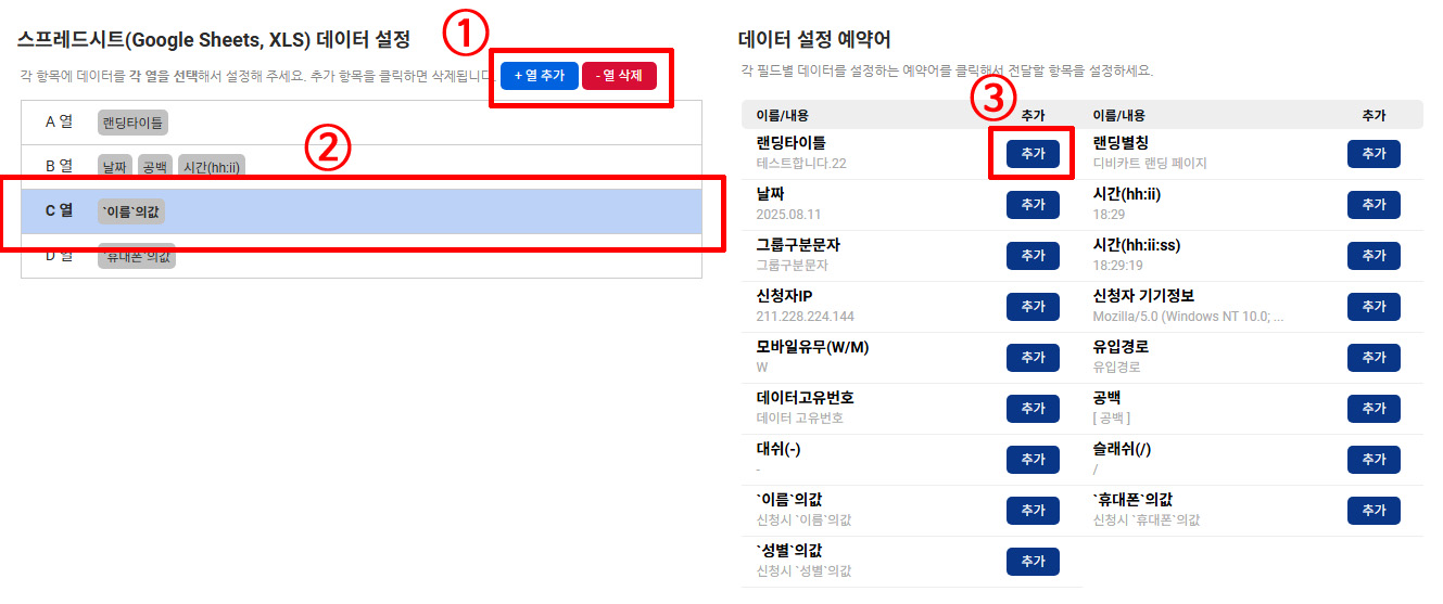 ① 열 추가를 통해서 시트 열애 데이터를 설정할 항목을 추가합니다.