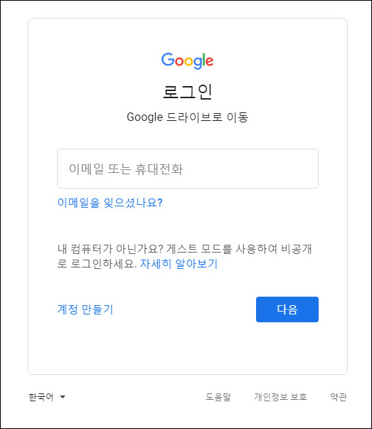 (계정이 없는경우 하단에 계정만들기를 통해서 구글 계정을 만드시면 됩니다.)
