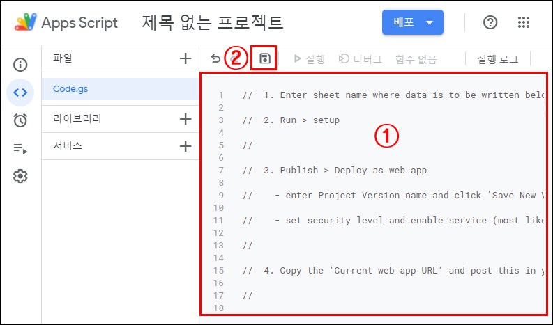 2) ① 스크립트 내용을 입력하고 ② 저장 합니다.