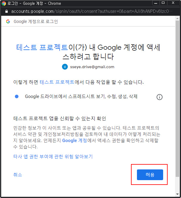 ('테스트 프로젝트'가 Google 계정에 액세스 허용한다는 이야기 입니다.)