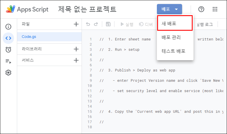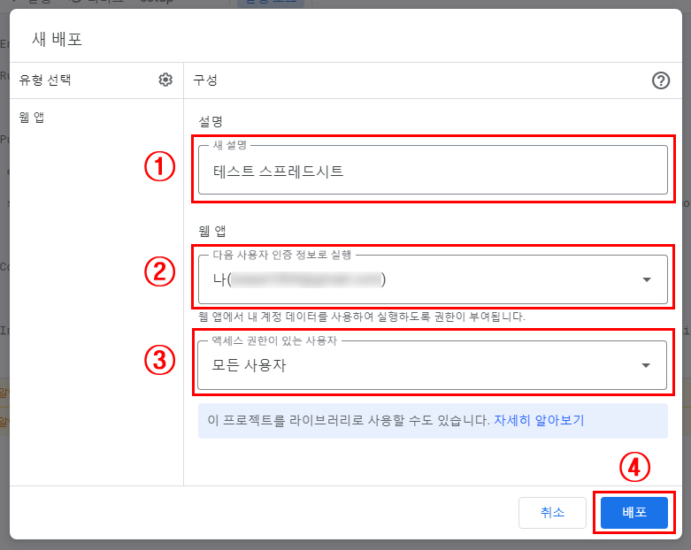 ① 해당 구글 스프레드시트 사용할 배포명(구분하기 위한 설명) 입력합니다.