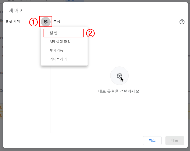 ① 유형 톱니바퀴를 선택 후 ② '웹 앱' 선택합니다.